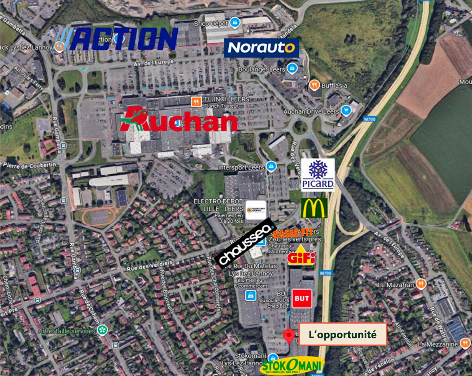 Situé sur la Zone des Verdiers, à proximité directe de Auchan Lys-lez-Lannoy, ce local bénéficie d'un emplacement stratégique au coeur d'un environnement commercial riche et dynamique, composé de nombreuses enseignes nationales.
